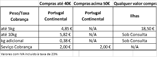 Portes de envio (encomendas de valor igual ou superior a €40 para Portugal Continental estão isentas de portes).